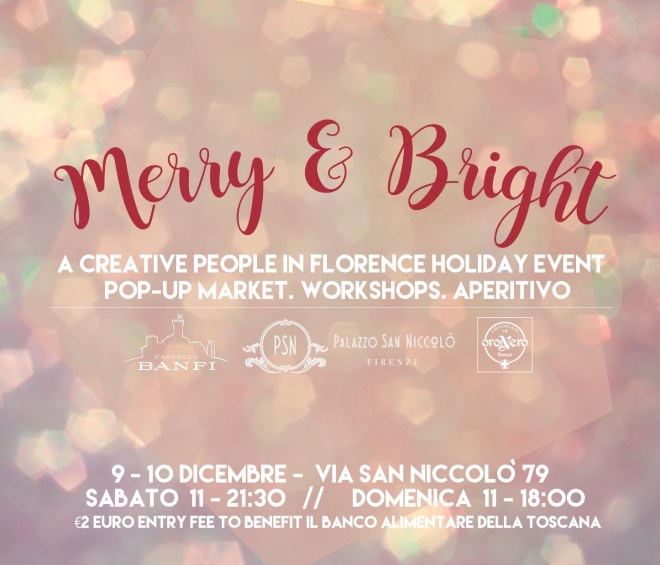 Creative People in Florence presenta per la terza volta il suo evento natalizio! Quest’anno siamo lietissimi di collaborare con Palazzo San Niccolò nel loro bellissimo e nuovissimo spazio, in una delle zone più belle di Firenze! Merry & Bright, A Creative People in Florence Holiday Event avrà luogo il 9 e 10 Dicembre e oltre ai workshops, degustazioni e un aperitivo il Sabato sera, comprenderà anche un Pop-Up Market esclusivo con un numero limitato di venditori che rappresentano la migliore qualità artigiana della città. Siamo grati ai nostri sponsors Oronero and Castello Banfi per la loro generosa presenza.