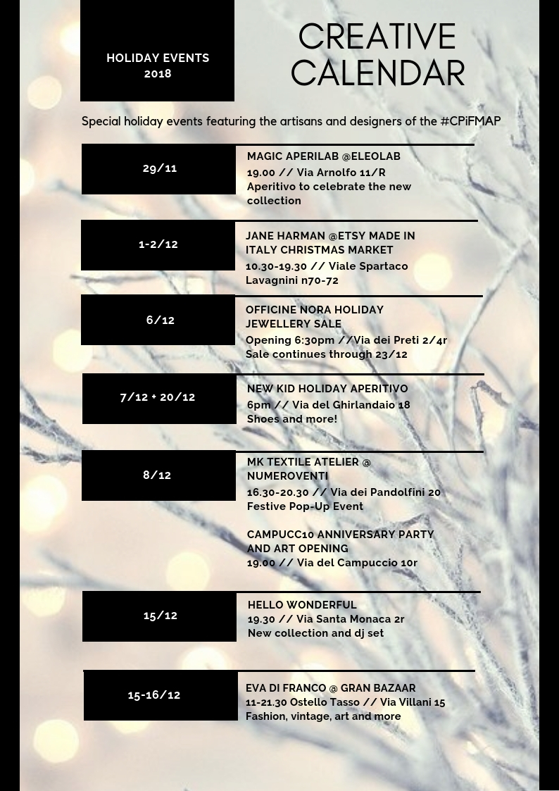 December 7 and 20 // Holiday Aperitivo at New Kid Footwear // 6-8pm // Via del Ghirlandaio 18